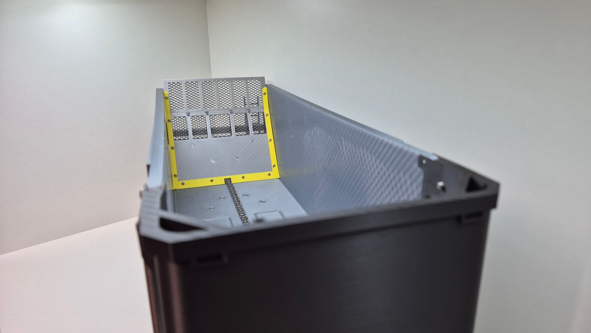 Die Abschiebewand wird über einen robusten Kettenmechanismus bewegt, angetrieben von einem leistungsstarken 12-Volt-Getriebemotor. Dadurch lassen sich unterschiedlichste Ladegüter zuverlässig und kraftvoll entladen – von leichtem, losem Material bis hin zu Hackschnitzeln, Sand oder Erde.